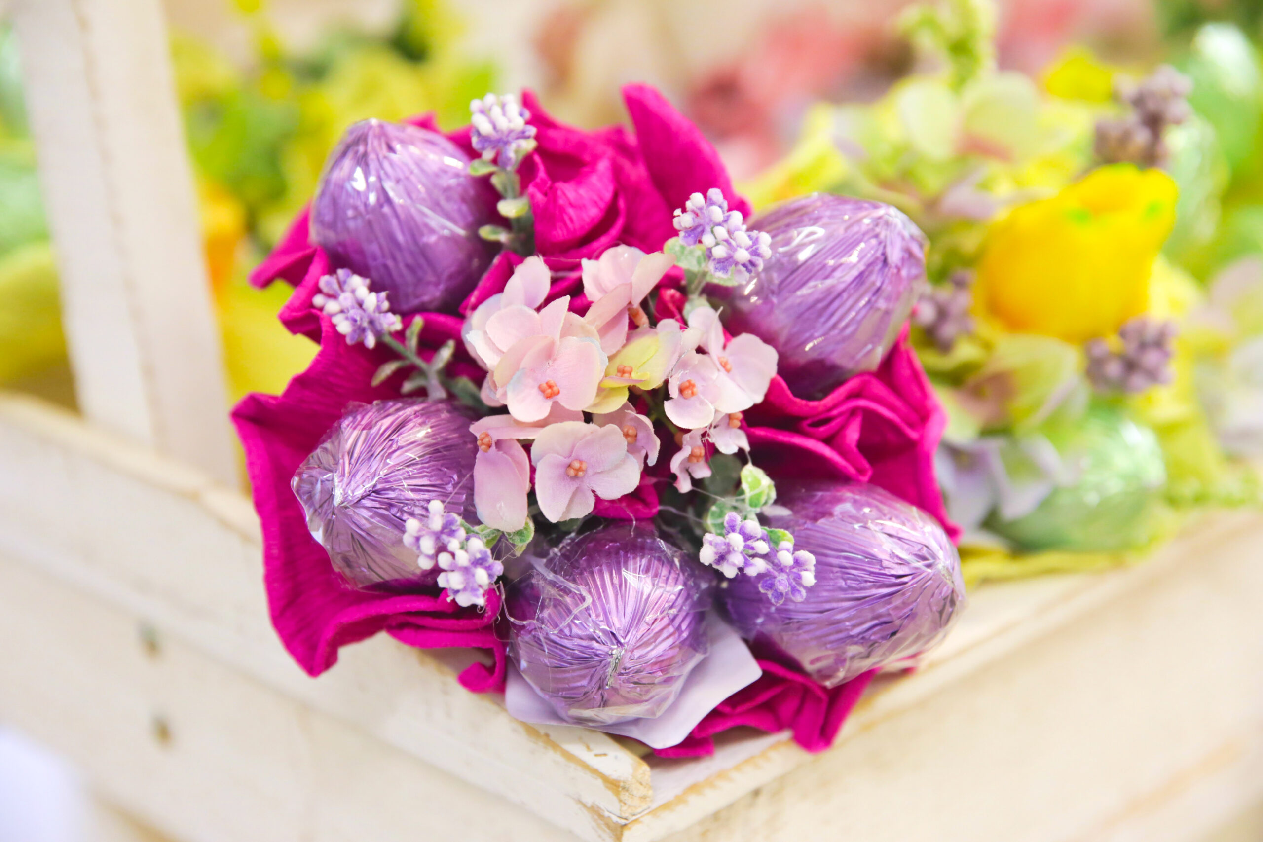 Molto scenografico anche il bouquet da 3 o 7 ovetti pasquali, nella confezione rispettivamente da 100 e 210 grammi.
